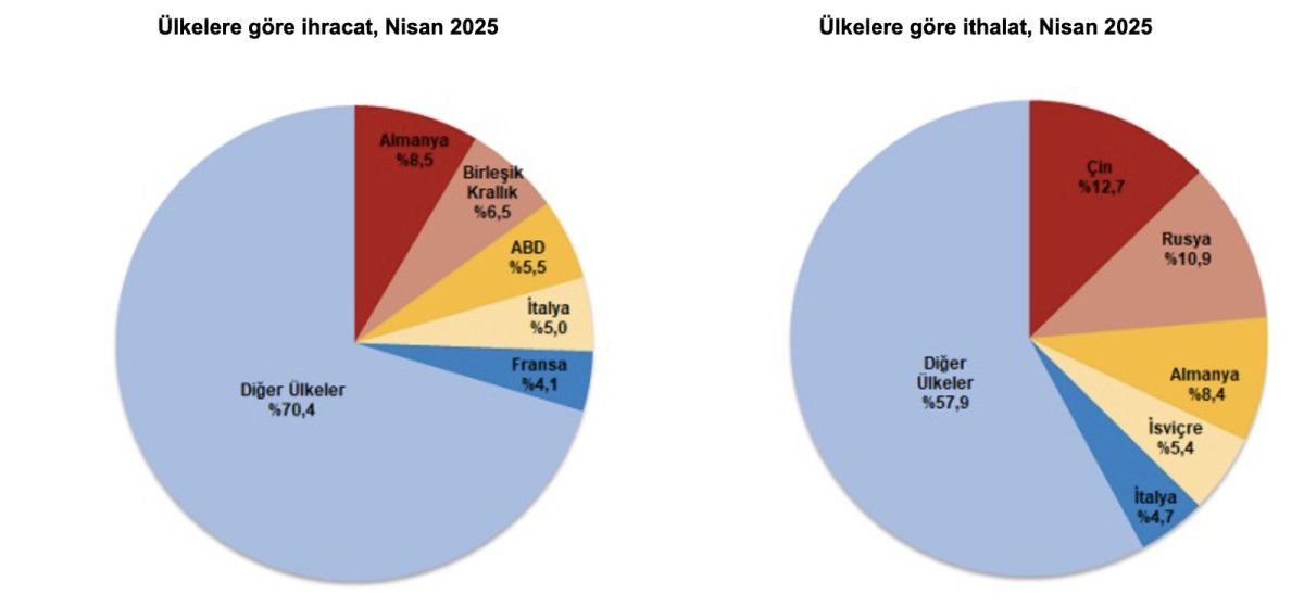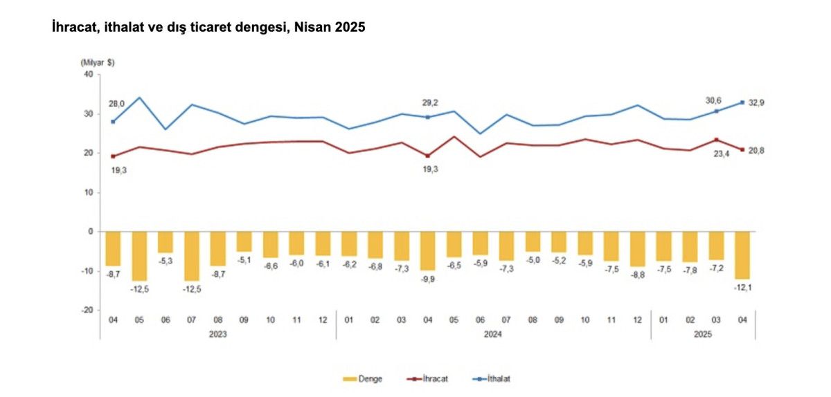 Buna nazaran ihracat 2025 yılı Nisan ayında, bir evvelki yılın tıpkı ayına nazaran yüzde 7,8 artarak 20 milyar 801 milyon dolar, ithalat yüzde 12,7 artarak 32 milyar 893 milyon dolar olarak gerçekleşti.