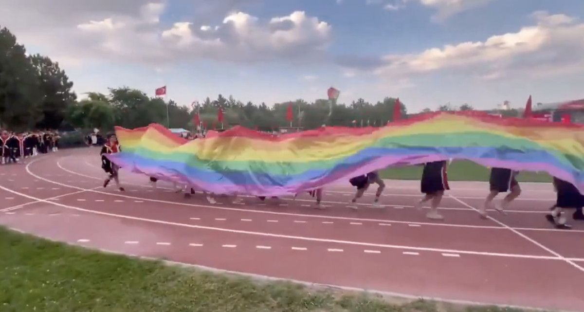 Mezuniyet merasiminde sahneye çıkan ve ellerinde LGBT bayrakları olan öğrenciler, koşarak bayrağı tüm sahnede açmaya çalıştı.