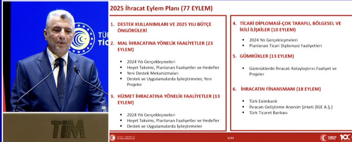 Bakan Bolat, 2025 için mal ve hizmet ihracatını artıracak destekleri kapsayan 77 eylem maddesinden oluşan eylem planını açıklayarak, bu kapsamda ihracatçılara verilen destek ve destek mekanizmalarını içeren yeni projeler yürütüleceğini belirtildi.
