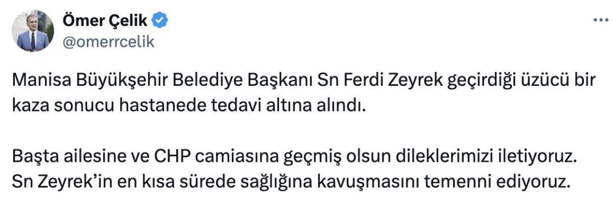 Ak Parti Sözcüsü Ömer Çelik, ağır bakımda tedavisi süren Ferdi Zeyrek’e ait geçmiş olsun bildirisi yayınladı.