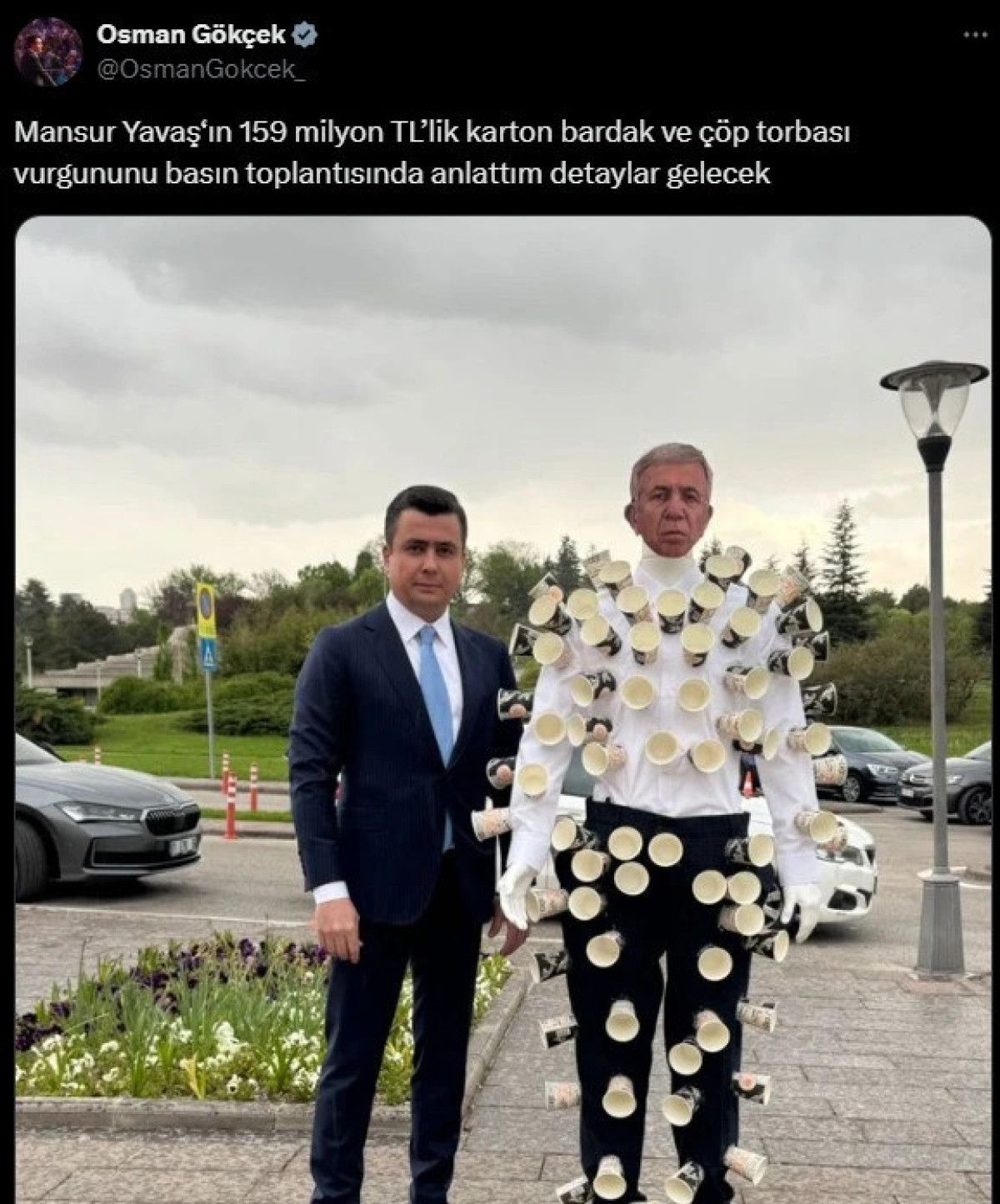 Cansız model ile çekildiği fotoğrafı toplumsal medya hesabından paylaşan Osman Gökçek, “Mansur Yavaş‘ın 159 milyon TL’lik karton bardak ve çöp torbası vurgununu basın toplantısında anlattım, ayrıntılar gelecek.” sözlerini kullandı.