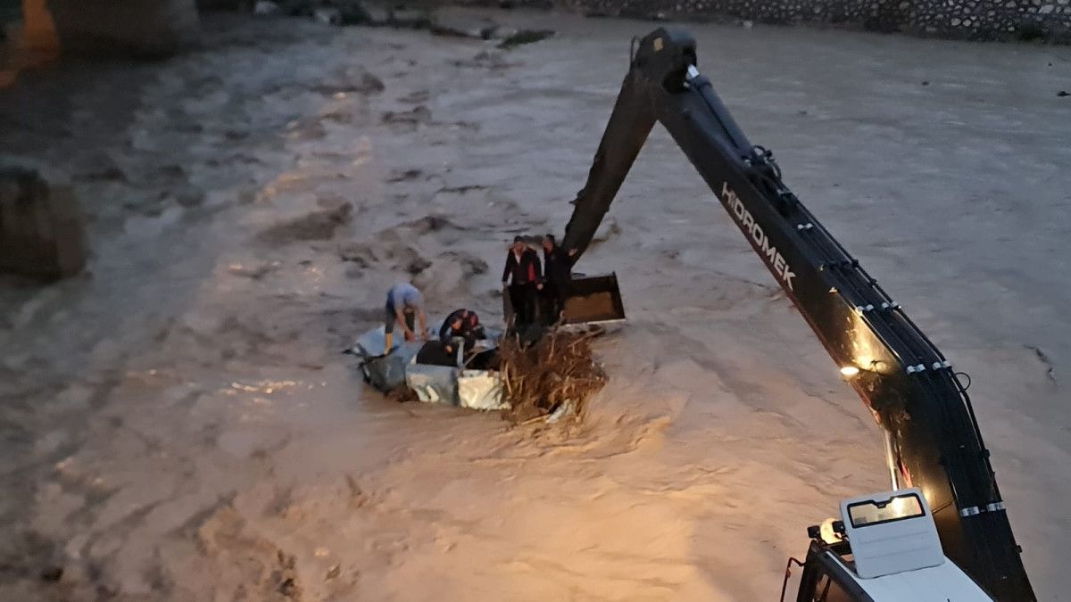 Araçların dere yatağından çıkarılması için iş makinelerinin dayanağıyla çalışma başlatıldı.