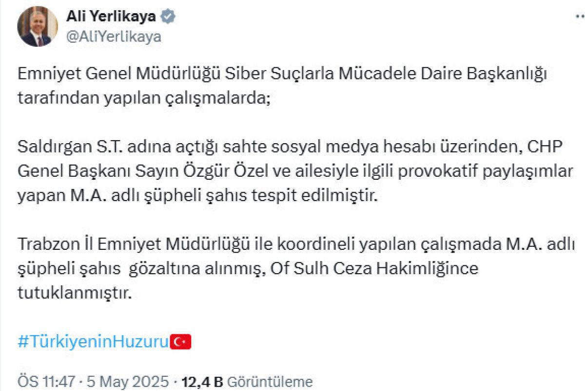 Saldırgan S.T. ismine açtığı geçersiz toplumsal medya hesabı üzerinden, CHP Genel Lideri Sayın Özgür Özel ve ailesiyle ilgili provokatif paylaşımlar yapan M.A. isimli kuşkulu şahıs tespit edilmiştir.