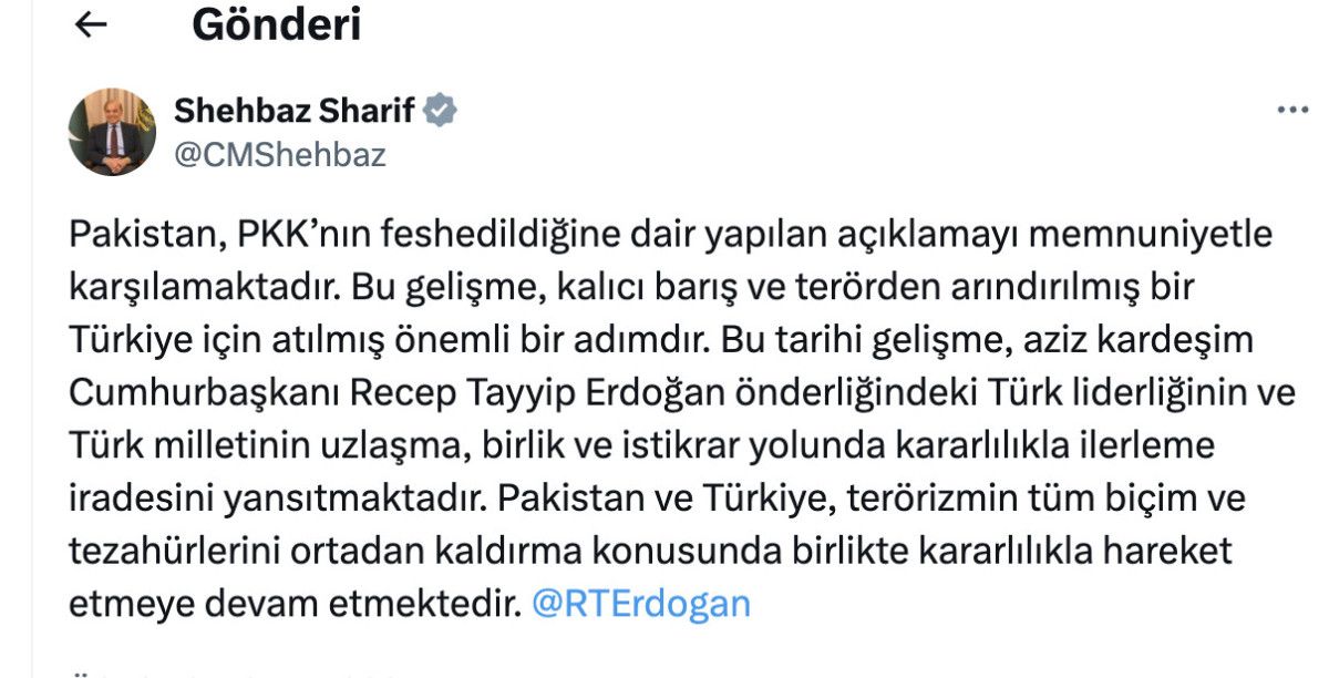 Pakistan, PKK’nın feshedildiğine dair yapılan açıklamayı memnuniyetle karşılamaktadır. Bu gelişme, kalıcı barış ve terörden arındırılmış bir Türkiye için atılmış değerli bir adımdır.