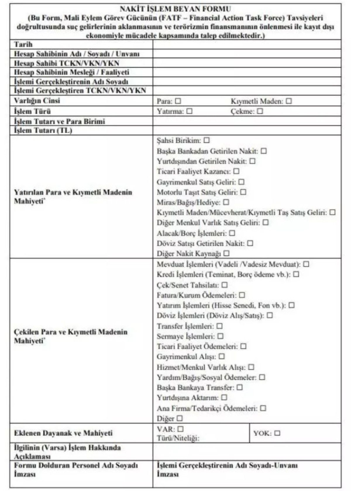 Yayımlanan taslağa nazaran finansal kuruluşlar, süreç fiyatı ya da birbiriyle irtibatlı birden fazla sürecin toplam meblağı 20 milyon TL’yi aşan nakit süreçlerde Nakit Süreç Beyan Formunun, ayrıntılı bir açıklama içerecek halde ve ilgili destekleri eklenmek suretiyle doldurulmasını sağlamakla yükümlü olacak. Yani kelam konusu formun doldurulmasının yanında fonun kaynağında dair de açıklama yapılması zarurî olacak.