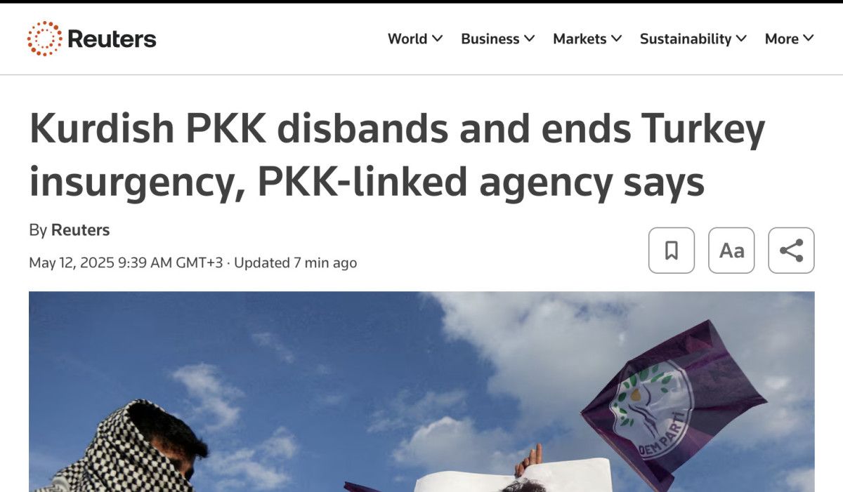İngiliz basınının esaslı gazetelerinden Reuters, PKK’nın fesih kararını ‘PKK kendini feshetti, Türkiye’ye yönelik silahlı isyan sona erdi’ başlığıyla duyurdu.