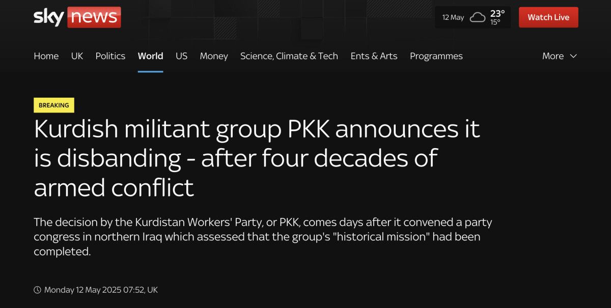 İngiltere merkezli Sky News, terör örgütü PKK’nın kendini fesih kararını, “PKK kendini feshetti, 40 yıllık silahlı çatışma sona erdi”. başlığıyla yayınladı.