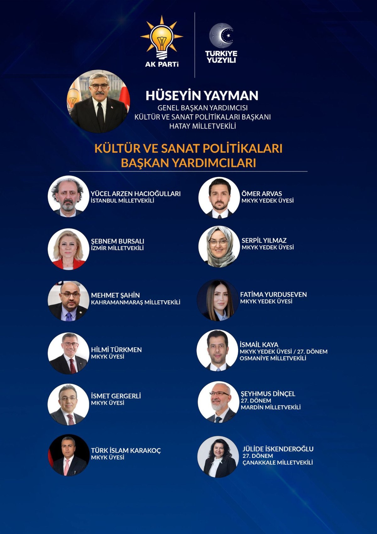 Kültürel mirasın korunması, sanatın teşvik edilmesi ve kültür-sanat politikalarının güçlendirilmesi adına çalışmalar yürütecek olan bu ekip, AK Parti’nin sanat ve kültüre yönelik vizyonunu hayata geçirmeyi hedefliyor. Hüseyin Yayman’ın başkanlığında görev alacak 12 başkan yardımcısının isimleri de paylaşıldı: