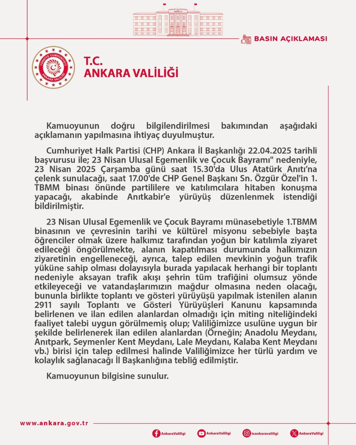 Cumhuriyet Halk Partisi (CHP) Ankara İl Başkanlığı 22.04.2025 tarihli başvurusu ile; 23 Nisan Ulusal Egemenlik ve Çocuk Bayramı” nedeniyle, 23 Nisan 2025 Çarşamba günü saat 15.30’da Ulus Atatürk Anıtı’na çelenk sunulacağı, saat 17.00’de CHP Genel Başkanı Sn. Özgür Özel’in 1. TBMM binası önünde partililere ve katılımcılara hitaben konuşma yapacağı, akabinde Anıtkabir’e yürüyüş düzenlenmek istendiği bildirilmiştir.