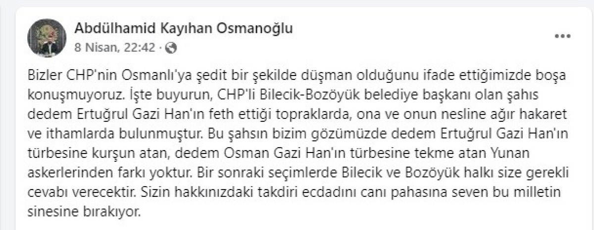 Abdülhamit Kayıhan Osman, “Bizler CHP’nin Osmanlı’ya şedit bir şekilde düşman olduğunu ifade ettiğimizde boşa konuşmuyoruz. İşte buyurun, CHP’li Bilecik-Bozüyük Belediye Başkanı olan şahıs dedem Ertuğrul Gazi Han’ın fethettiği topraklarda, ona ve onun nesline ağır hakaret ve ithamlarda bulunmuştur.