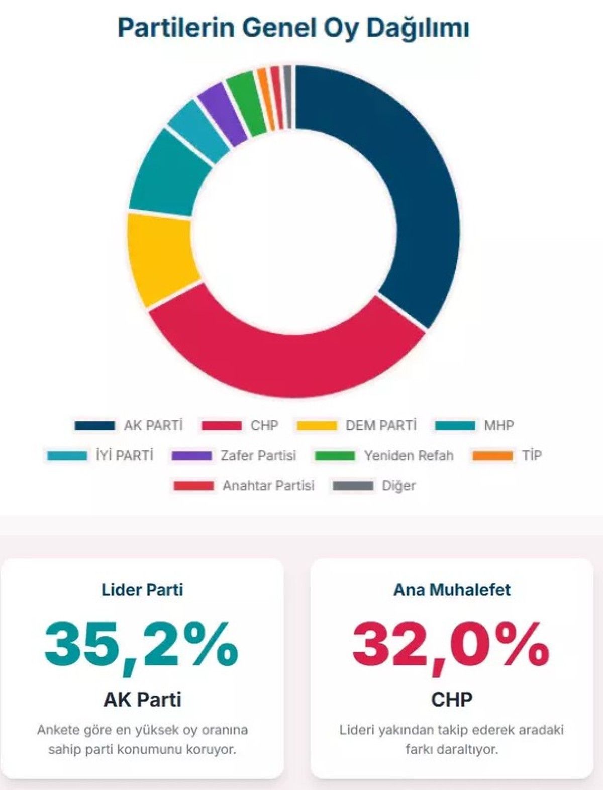 Ankete göre, AK Parti yüzde 35,2 ile birinci sırada yer alırken, CHP yüzde 32 ile ikinci oldu.