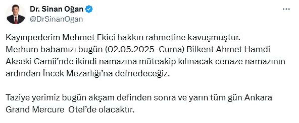Ekici’nin vefat haberini, kamuoyuyla eski Cumhurbaşkanı adayı Sinan Oğan, toplumsal medya üzerinden paylaştı.