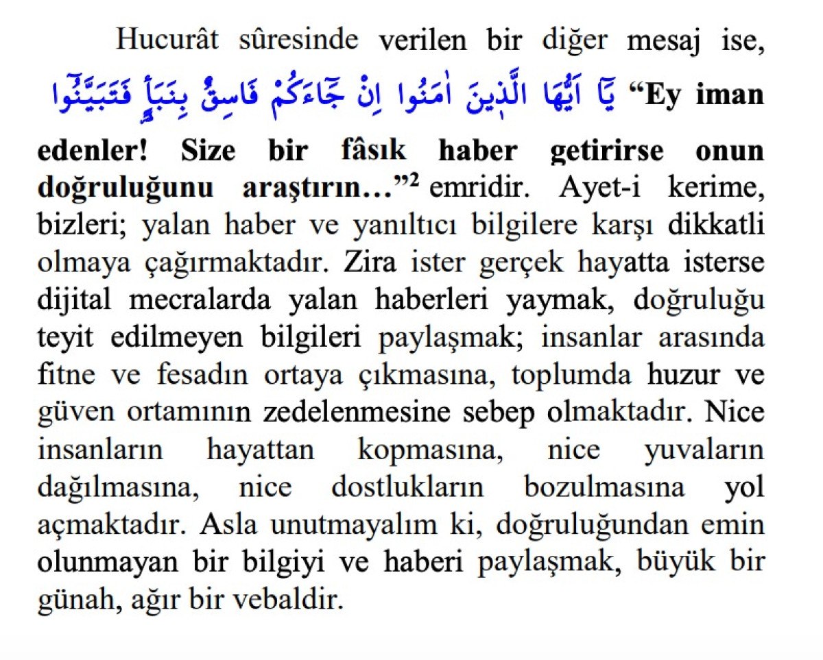 Yalan haber ve yanıltıcı bilgiler karşısında yapılması gerekenlerin ele alındığı hutbede, Hucurât Suresinden bir ayetle şu ifadelere yer verildi;