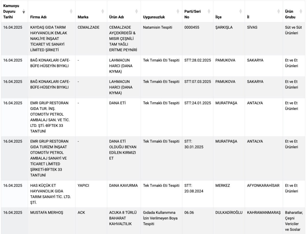 Tarım ve Orman Bakanlığı’nın “Sağlığı Tehlikeye Düşürecek Gıdalar” listesine 7 yine ürün katıldı ve bu listede ki ürün sayısı 216’ya yükseldi.