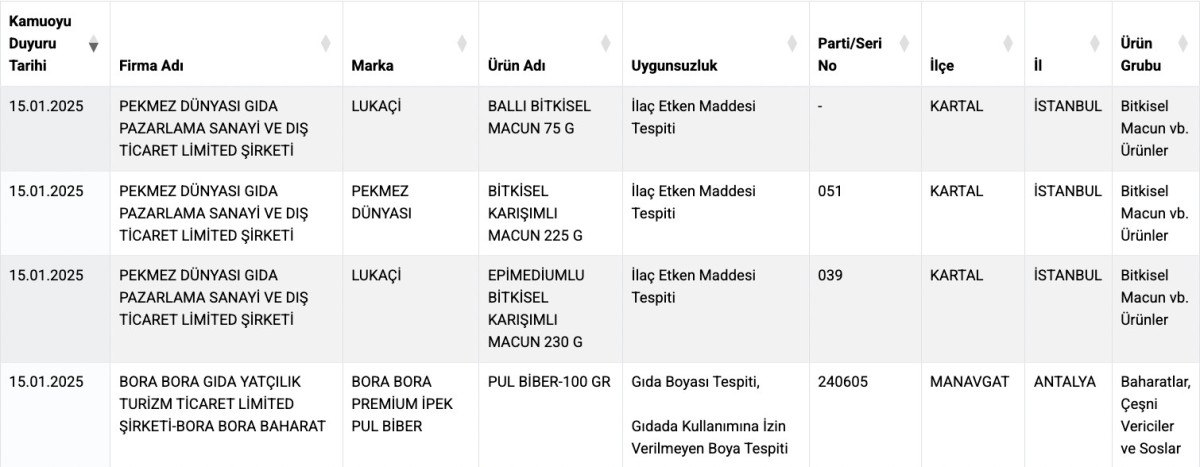 İstanbul Kartal’da bulunan Pekmez Dünyası Gıda Pazarlama Sanayi ce Dış Ticaret Limited Şirketi, Lukaçi ve Pekmez Dünyası Marka Ballı Bitkisel Macun 75 g üründen bu kez “ilaç etken maddesi tespiti” yapıldı.