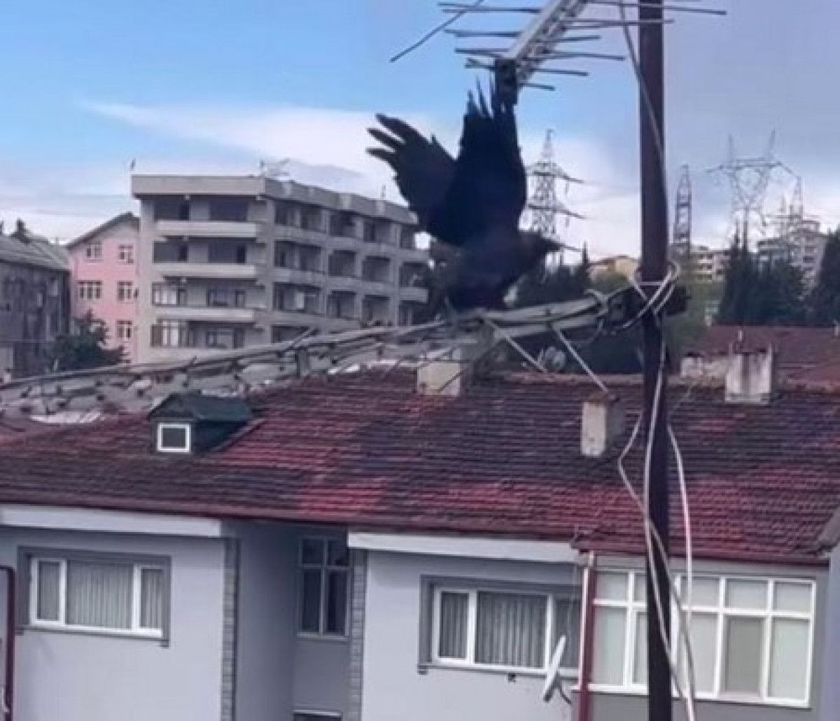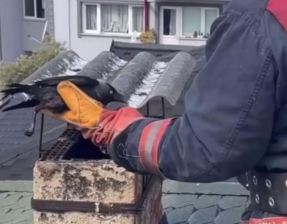 Merdivenli araçla çatıya çıkan itfaiye erleri, antene sıkışan kargayı bulunduğu yerden kurtardı. Hür kalan karga, uçarak bölgeden uzaklaştı. O anlar toplumsal medya hesabından paylaşıldı.