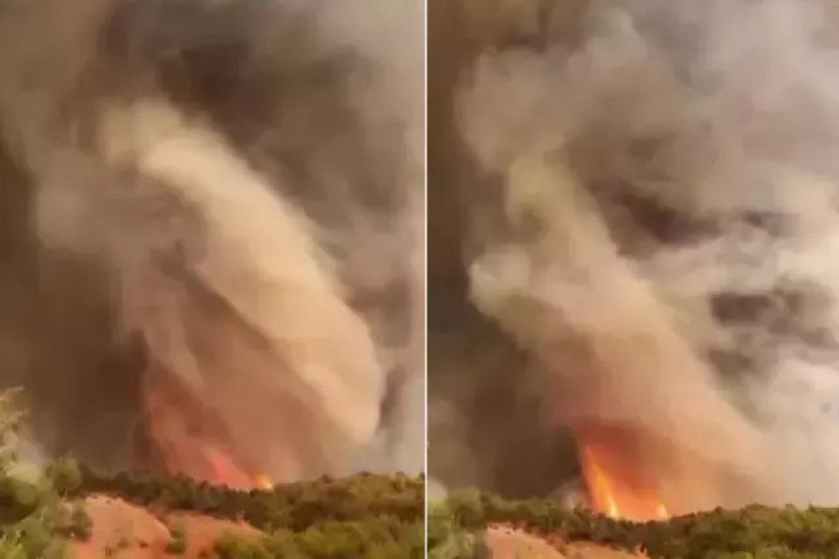 Görüntülerde, alevlerin dönerek gökyüzüne gerçek yükseldiği, adeta bir ‘yangın hortumu’ oluşturduğu anlar yer aldı.