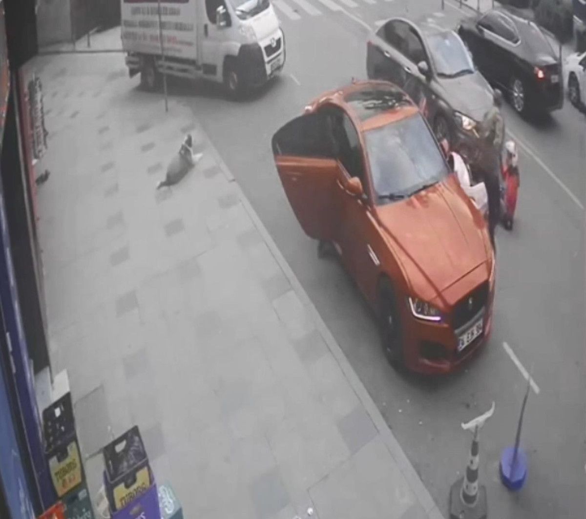 Motosikleti ise esnaf tarafından kaldırım kenarına alındı. Akabinde bayan ile araba şoförü ortasında tartışma yaşandı. Yaşananlar güvenlik kameralarına yansıdı.