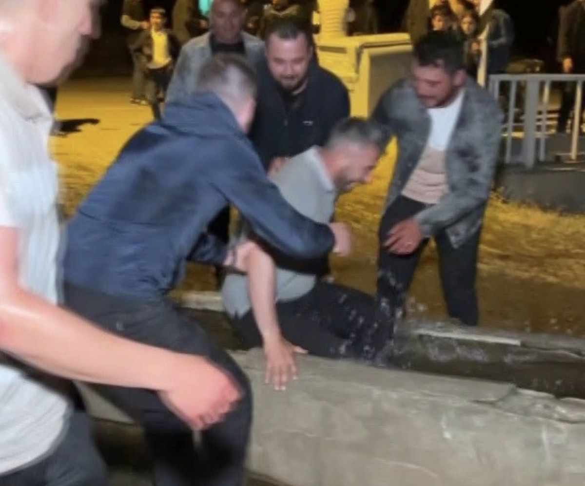 Ancak eski bir köy adet geleneğinin gereği halaya girmemekte ısrar eden konuklar, köy halkı tarafından yaka paça alınarak halk ortasında “kürün” olarak isimlendirilen su dolu yalağın içerisine atıldı.