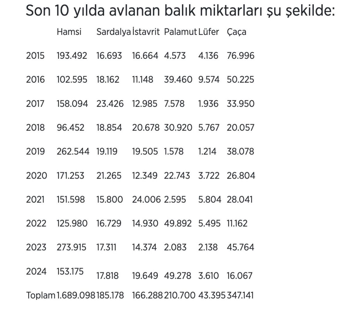 10 yılda en fazla avlanan hansinin akabinde çaça, palamut, sardalya, istavrit ve lüfer geldi.