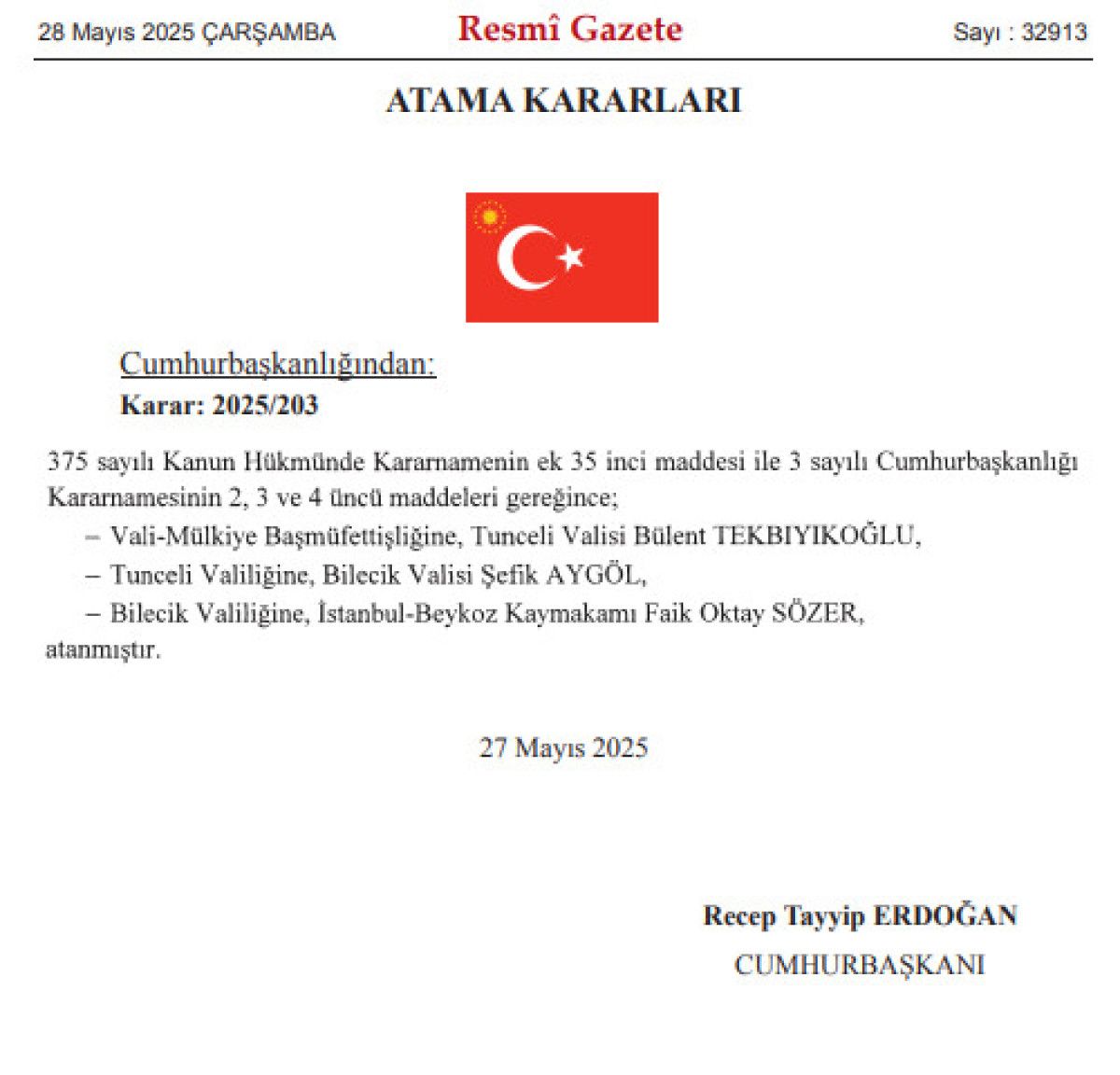 Son dakika haberine nazaran; Vali-Mülkiye Başmüfettişliği’ne Tunceli Valisi Bülent Tekbıyıkoğlu, Tunceli Valiliği’ne Bilecik Valisi Şefik Aygöl, Bilecik Valiliği’ne İstanbul Beykoz Kaymakamı Faik Oktay Sözer atandı.