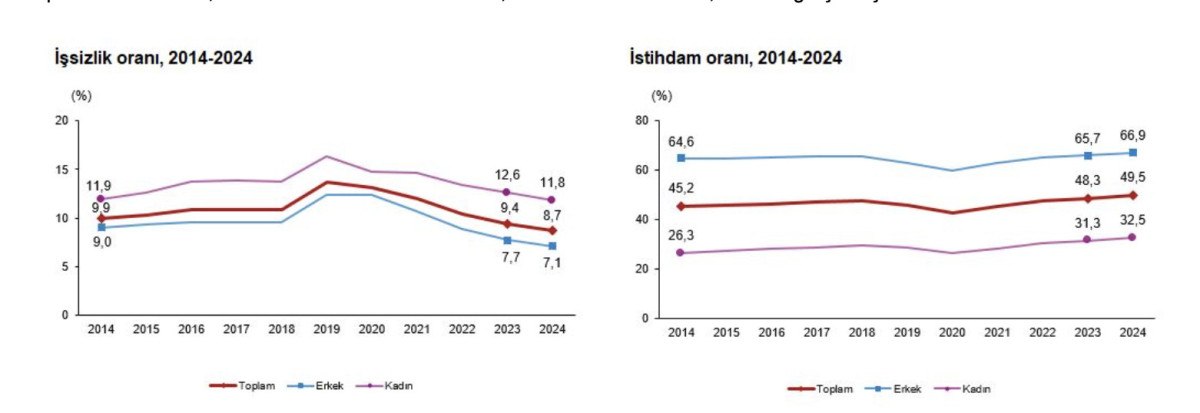 İstihdam edilenlerin sayısı 2024 yılında bir önceki yıla göre 988 bin kişi artarak 32 milyon 620 bin kişi, istihdam oranı ise 1,2 puan artarak yüzde 49,5 oldu.