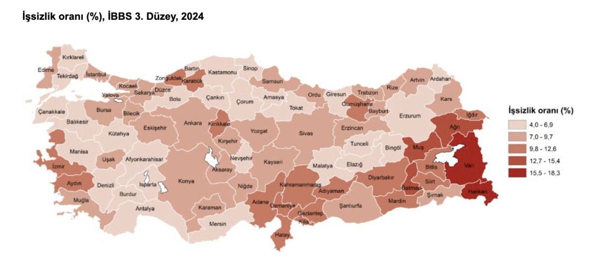 İşsizlik oranı en düşük iller yüzde 4 ile Burdur ve Kastamonu iken, işsizlik oranı en yüksek il yüzde18,3 ile Hakkari oldu.