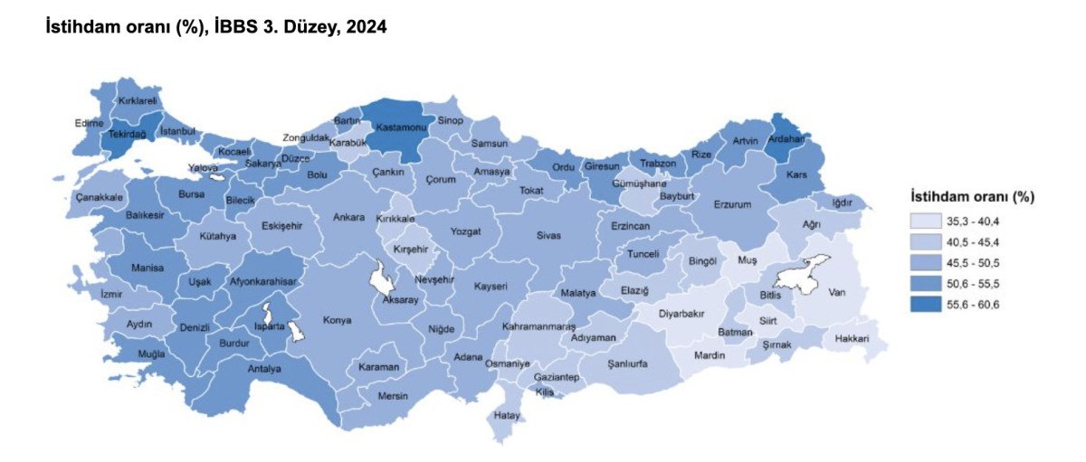 En yüksek istihdam oranı yüzde60,6 ile Ardahan ilinde gerçekleşti. En düşük istihdam oranı ise yüzde35,3 ile Hakkari ilinde oldu.