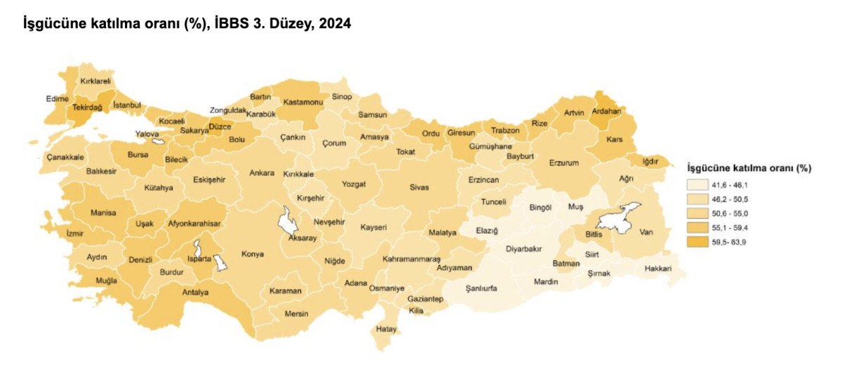 En yüksek işgücüne katılma oranı yüzde63,9 ile Ardahan ilinde gerçekleşti. En düşük işgücüne katılma oranı ise yüzde41,6 ile Siirt ilinde oldu.