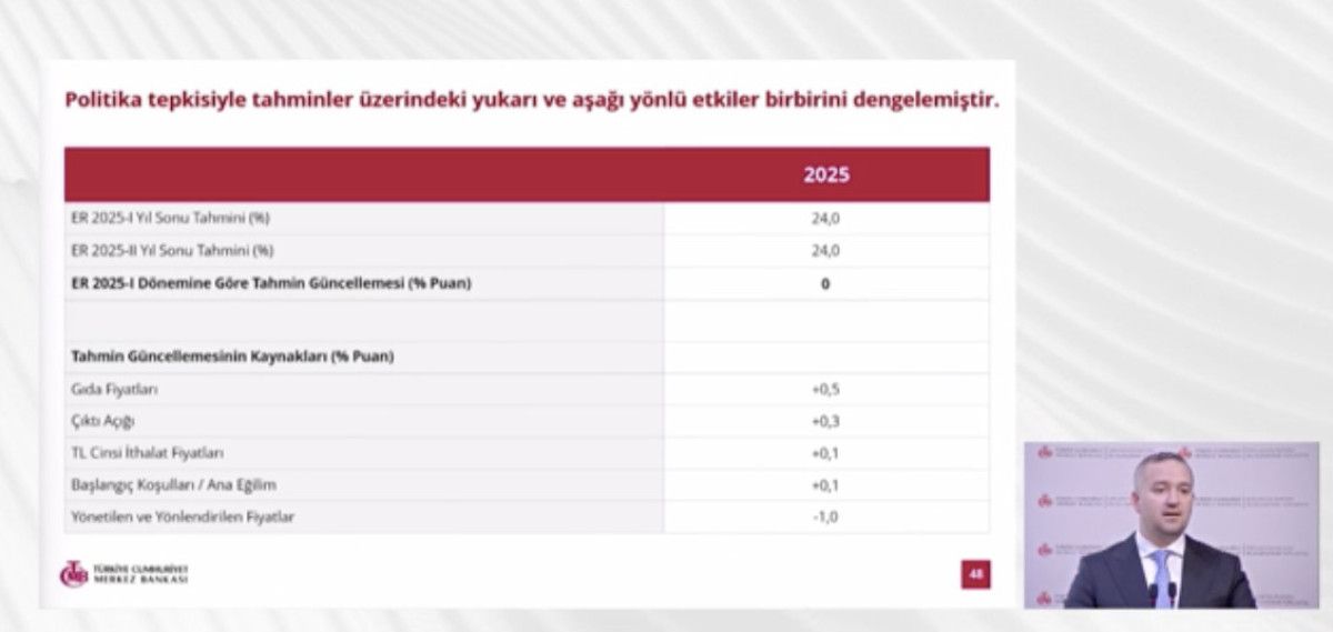7 Şubat’ta gerçekleştirilen Birinci Enflasyon Raporu bilgilendirme toplantısında, 2025 sonu için enflasyonun yüzde 24, 2026 yıl sonu için yüzde 12, 2027 sonunda yüzde 8’e geriledikten sonra orta vadede yüzde 5 düzeyinde istikrar kazanmasının hedeflendiği belirtilmişti.