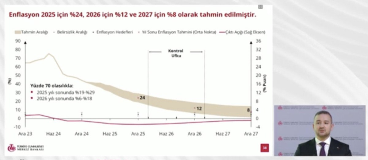 Karahan, enflasyon tahminlerini 2025 yıl sonunda yüzde 24, 2026’da yüzde 12 ve 2027 yılında yüzde 8 şeklinde aktarırken nihai hedefin ise yüzde 5 olduğunu belirtti.