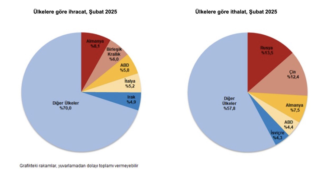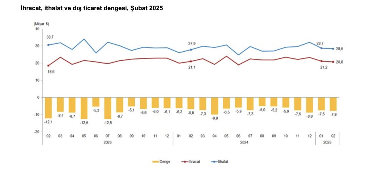 TÜİK ile Ticaret Bakanlığı iş birliğiyle genel ticaret sistemi kapsamında üretilen geçici dış ticaret verilerine göre; ihracat 2025 yılı Şubat ayında, bir önceki yılın aynı ayına göre yüzde 1,6 azalarak 20 milyar 761 milyon dolar, ithalat yüzde 2,4 artarak 28 milyar 533 milyon dolar olarak gerçekleşti.