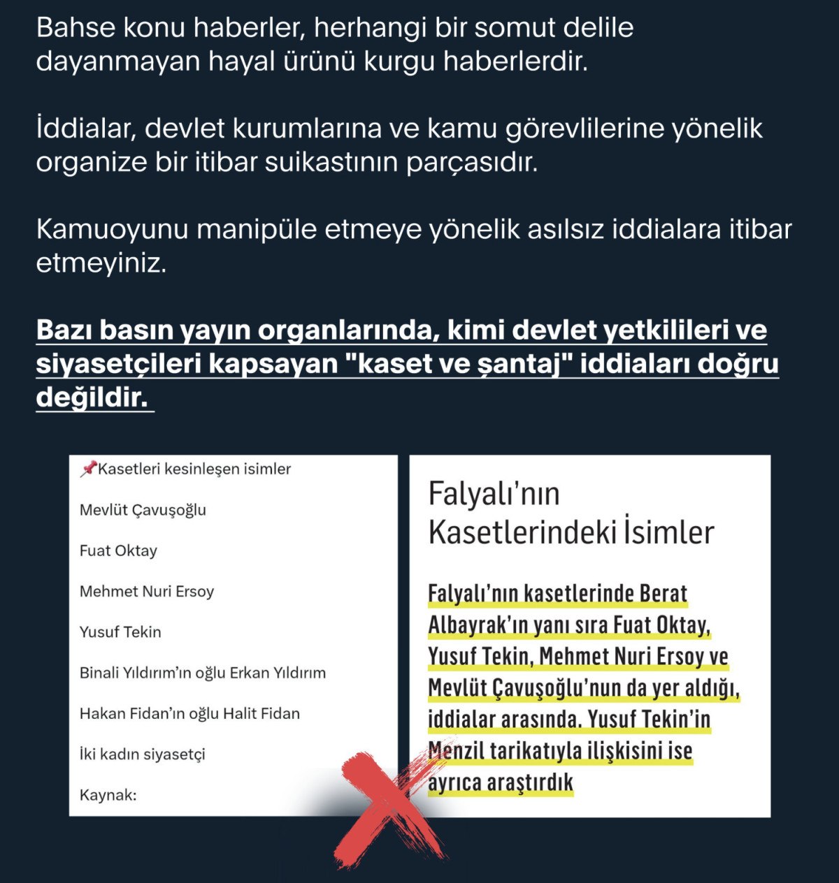 Açıklamada, “Bazı basın yayın organlarında, kimi devlet yetkilileri ve siyasetçileri kapsayan ‘kaset ve şantaj’ iddiaları doğru değildir. Bahse konu haberler, herhangi bir somut delile dayanmayan hayal ürünü kurgu haberlerdir. İddialar, devlet kurumlarına ve kamu görevlilerine yönelik organize bir itibar suikastının parçasıdır. Kamuoyunu manipüle etmeye yönelik asılsız iddialara itibar etmeyiniz.” ifadeleri kullanıldı.