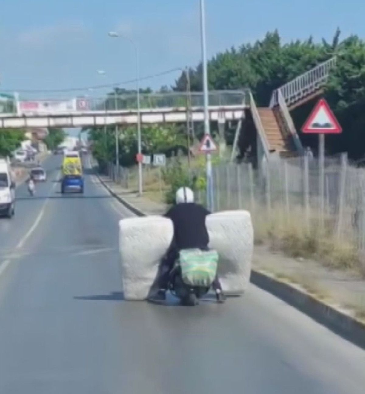 İstanbul Sultanbeyli’de bugün TEM Otoyolu Yanyolu üzerinde, bir motosiklet şoförünün çift kişilik bir yatağı taşıdığı anlar dikkat çekti.