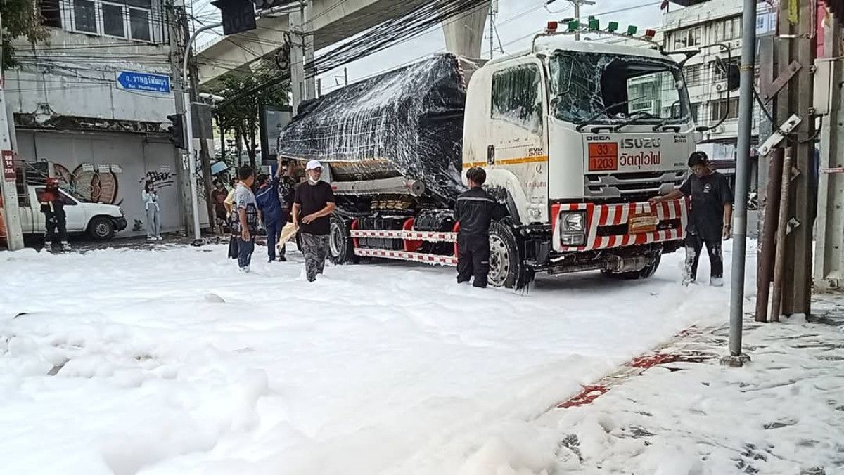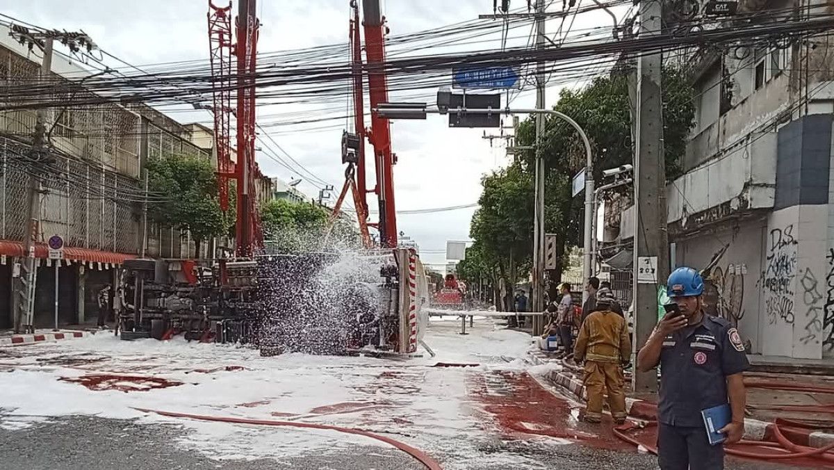 Bangkok’un Rat Burana ilçesinde seyreden akaryakıt yüklü bir tankere, dönüş yaptığı sırada tanker taşıtan bir tır çarptı.