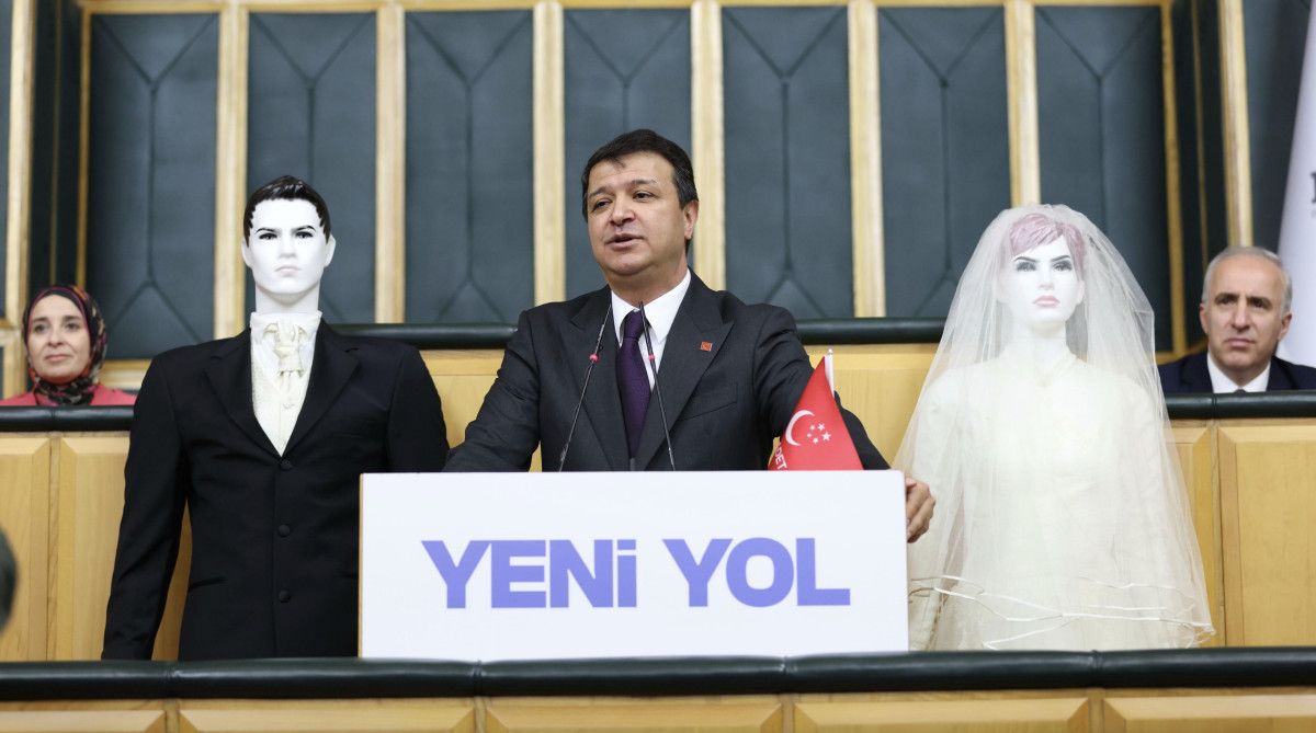 Kürsünün iki yanına gelinlik ve damatlık giydirilmiş cansız modeller yerleştiren Arıkan, evlilik çağındaki gençlerin ekonomik nedenlerle aile kuramadığını söyledi.