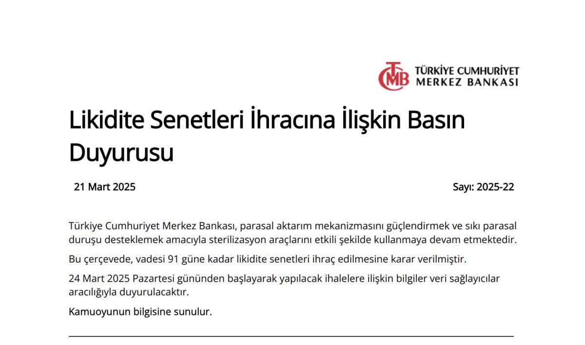 Türkiye Cumhuriyet Merkez Bankası (TCMB), parasal aktarım mekanizmasını güçlendirmek ve sıkı parasal duruşu desteklemek amacıyla sterilizasyon araçlarını etkili şekilde kullanmaya devam etttiğini duyurdu.
