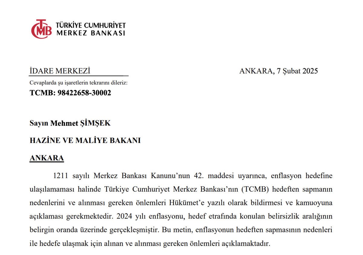2024 yılı enflasyonunun hedef etrafında konulan belirsizlik aralığının belirgin oranda üzerinde gerçekleştiğine işaret edilen mektupta, enflasyonun hedeften sapmasının nedenleri ile hedefe ulaşmak için alınan ve alınması gereken önlemler açıklandı.
