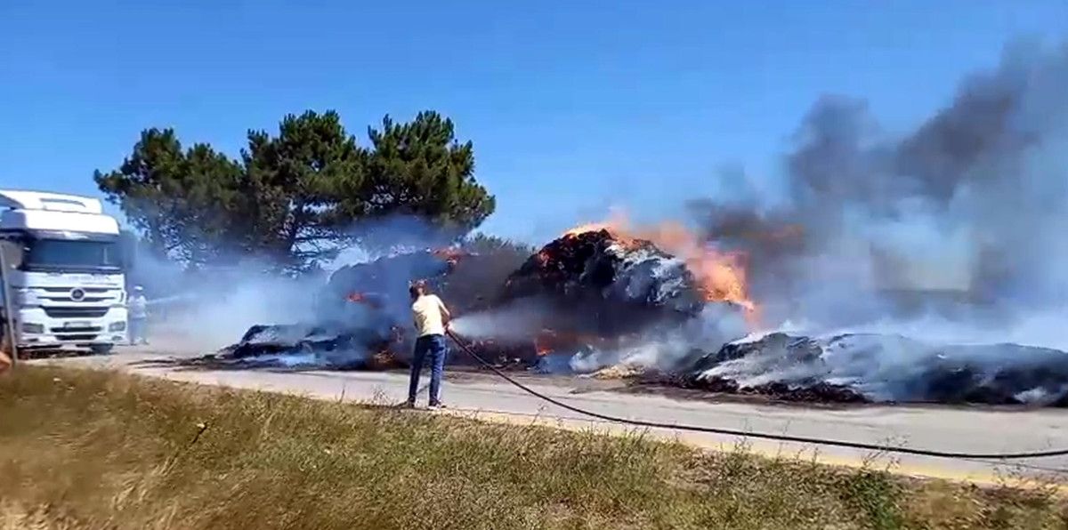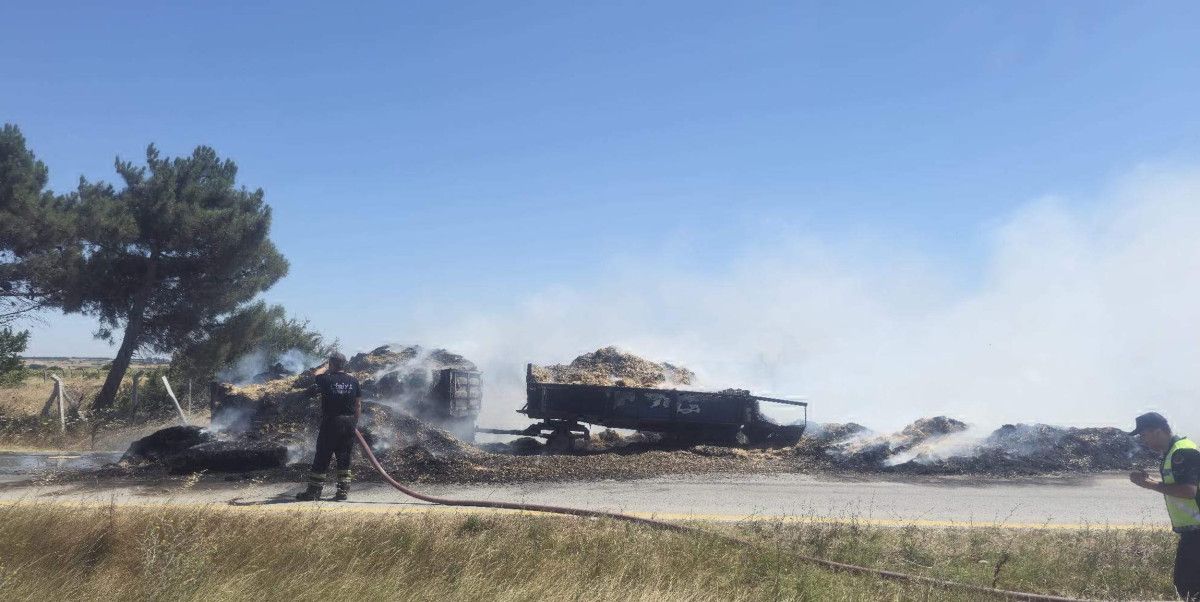 Tekirdağ’ın Saray ilçesi Yuvalı Mahallesi yakınlarında, Süleyman Anılar’ın kullandığı traktörün saman balyası yüklü römorkunda yangın çıktı.