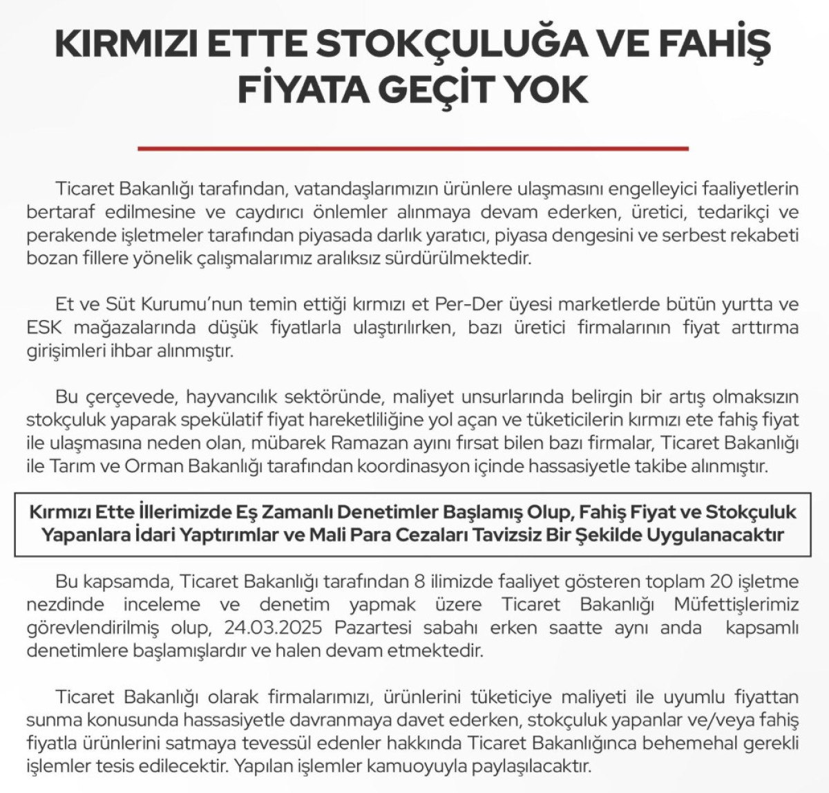 Kırmızı ette illerimizde eş zamanlı denetimler başlamış olup, fahiş fiyat ve stokçuluk yapanlara idari yaptırımlar ve mali para cezaları tavizsiz bir şekilde uygulanacaktır