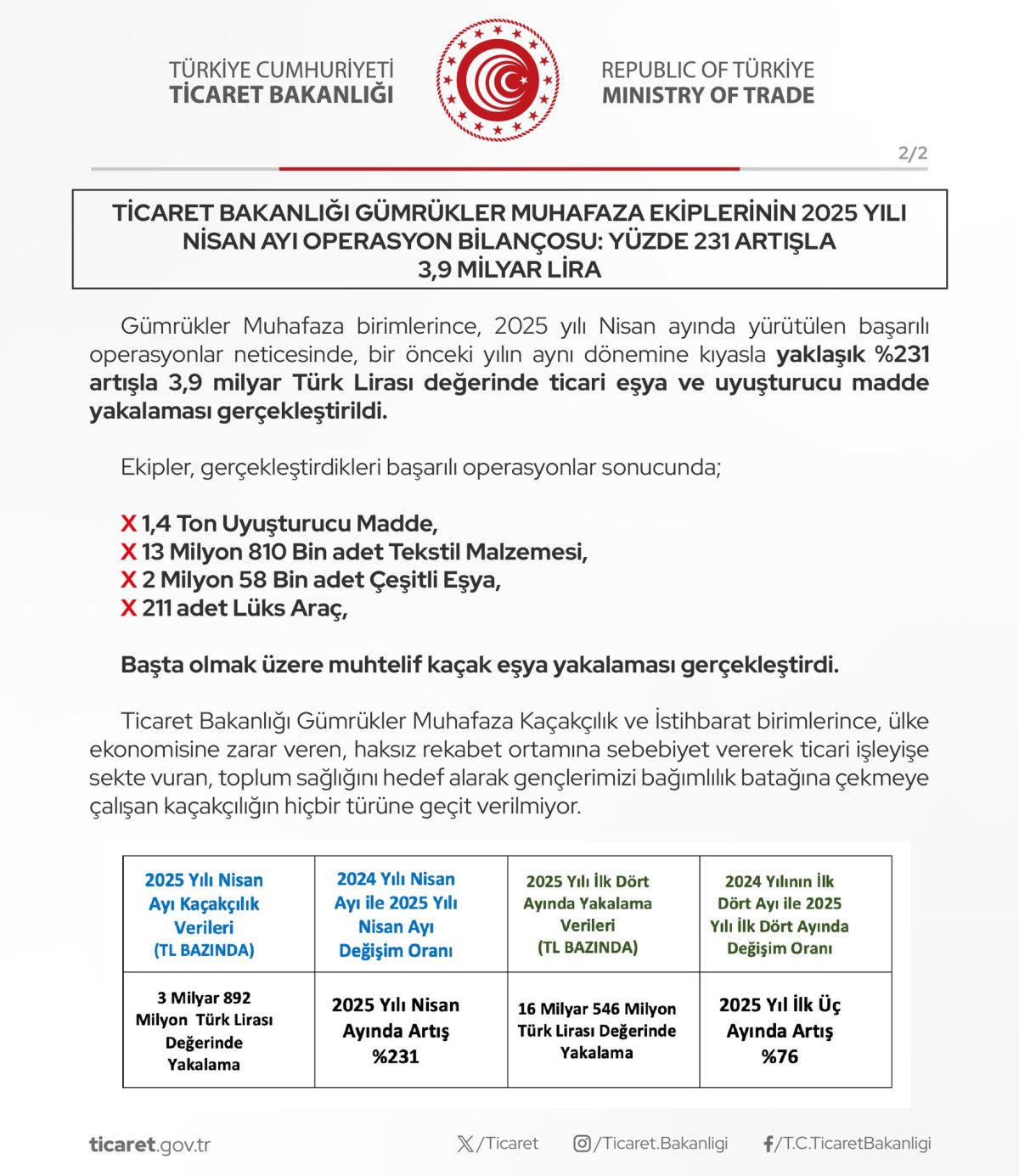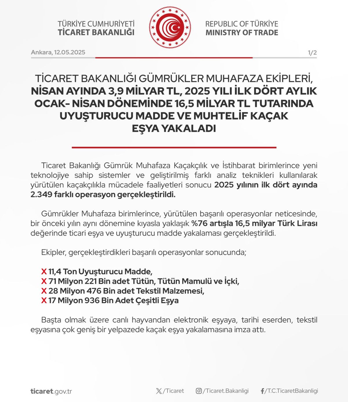 Ocak-Nisan devrinde düzenlenen 2.349 operasyonda toplam 16,5 milyar TL pahasında kaçak ticari eşya ve uyuşturucu unsur ele geçirilirken, sadece Nisan ayında yapılan operasyonların bilançosu geçen yılın birebir ayına nazaran yüzde 231 artışla 3,9 milyar TL’ye ulaştı.