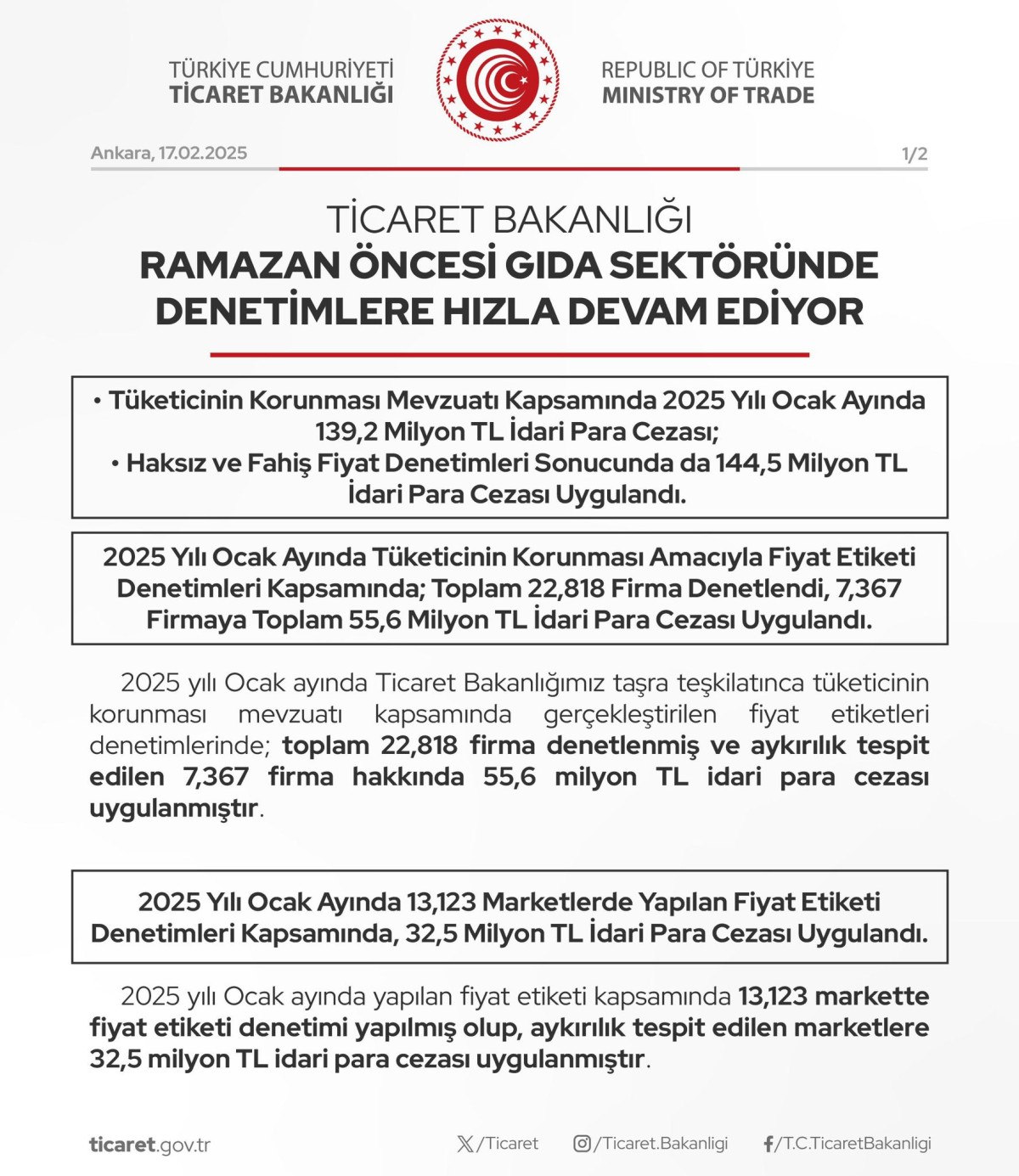 Tüketicinin korunması mevzuatı kapsamında 2025 yılı ocak ayında 139,2 milyon TL idari para cezası; haksız ve fahiş fiyat denetimleri sonucunda da 144,5 milyon TL idari para cezası uygulandı.