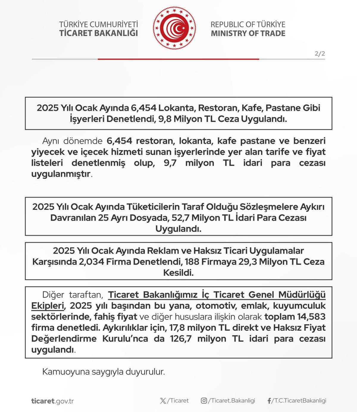 2025 yılı ocak ayında 6,454 lokanta, restoran, kafe, pastane gibi işyerleri denetlendi, 9,8 milyon TL ceza uygulandı.