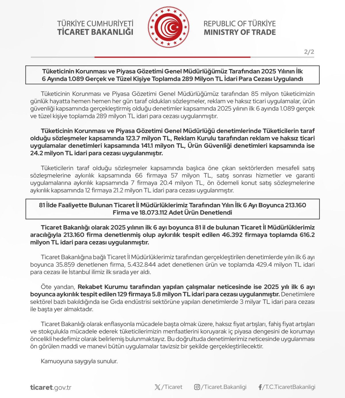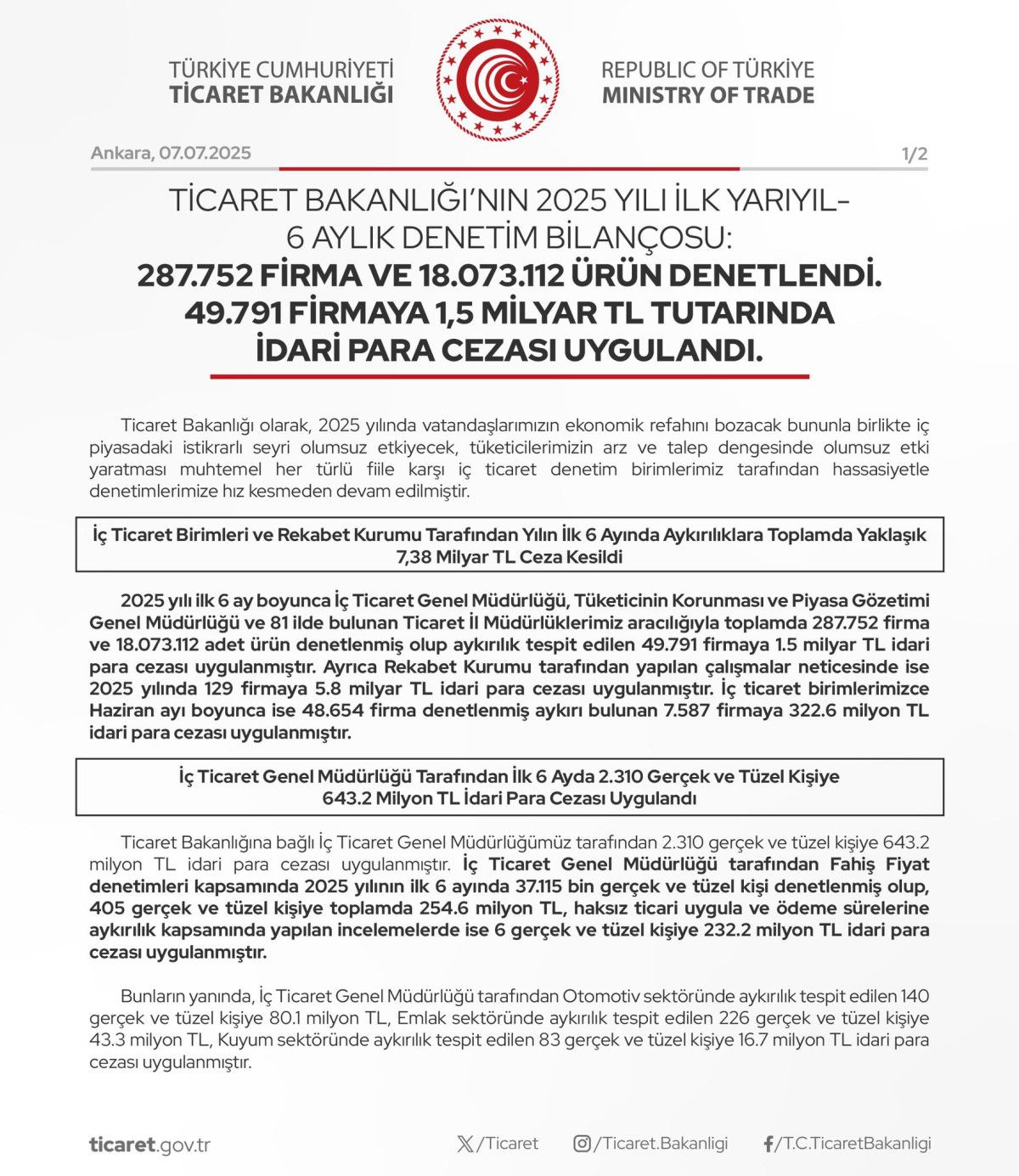 2025 yılı birinci 6 ay boyunca İç Ticaret Genel Müdürlüğü, Tüketicinin Korunması ve Piyasa Gözetimi Genel Müdürlüğü ve 81 vilayette bulunan Ticaret Vilayet Müdürlüklerimiz aracılığıyla toplamda 287 bin 752 firma ve 18 milyon 73 bin 112 adet eser denetlenmiş olup karşıtlık tespit edilen 49 bin 791 firmaya 1,5 milyar TL idari para cezası uygulanmıştır.