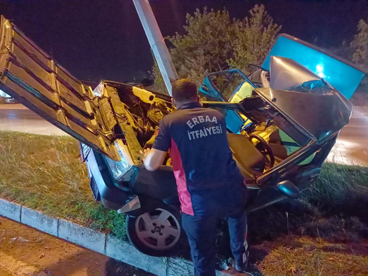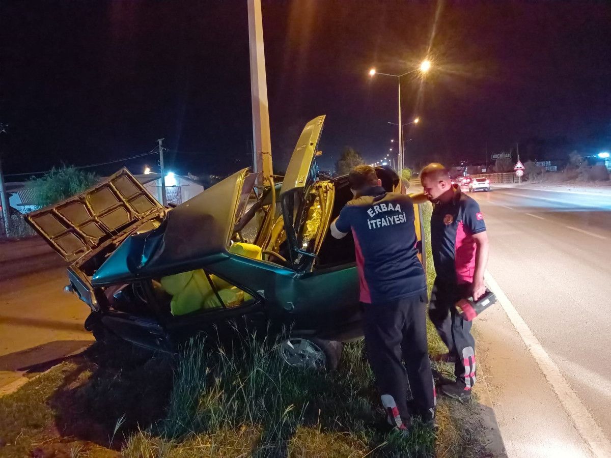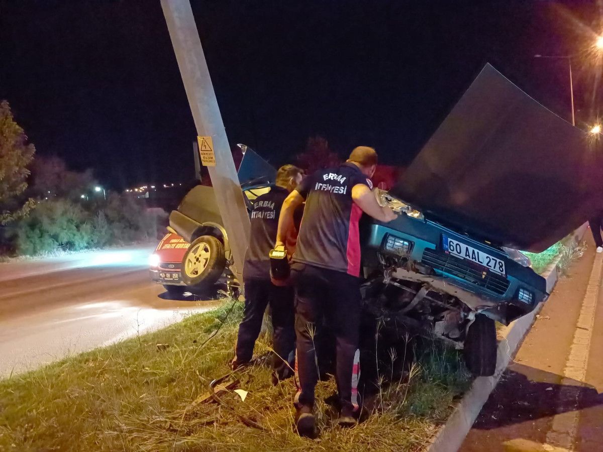 Tokat’ta elektrik direğine çarpan araç hurdaya döndü
