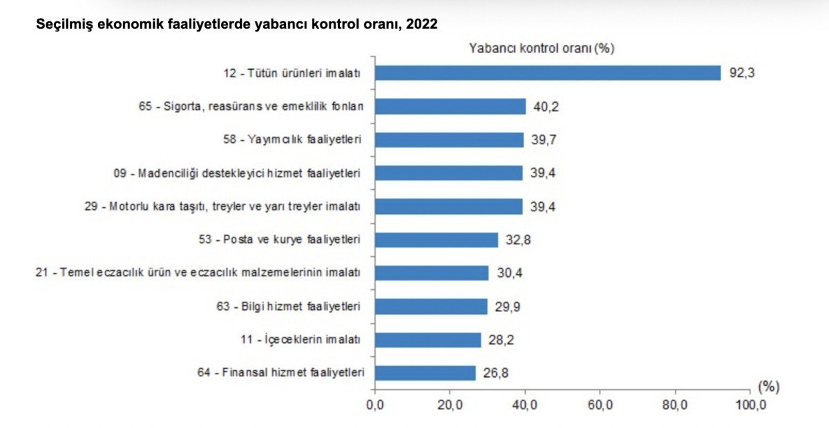 Tütün ürünleri imalatı, 2022 yılında yabancı kontrollü girişimlerin ciro payının yüzde 92,3 ile en yüksek olduğu faaliyet oldu. Yabancı kontrollü girişimlerin ciro payının en yüksek olduğu ikinci faaliyet ise yüzde 40,2 ile sigorta, reasürans ve emeklilik fonları oldu.