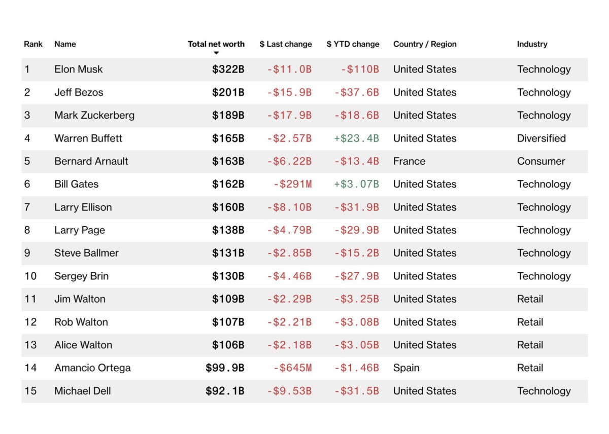 Listenin zirvesinde 322 milyar dolarlık servetiyle Elon Musk bulunuyor. Ancak Tesla ve SpaceX CEO’su, bu yıl şu ana kadar 110 milyar dolar kaybederek en büyük düşüşü yaşayan isim oldu.
