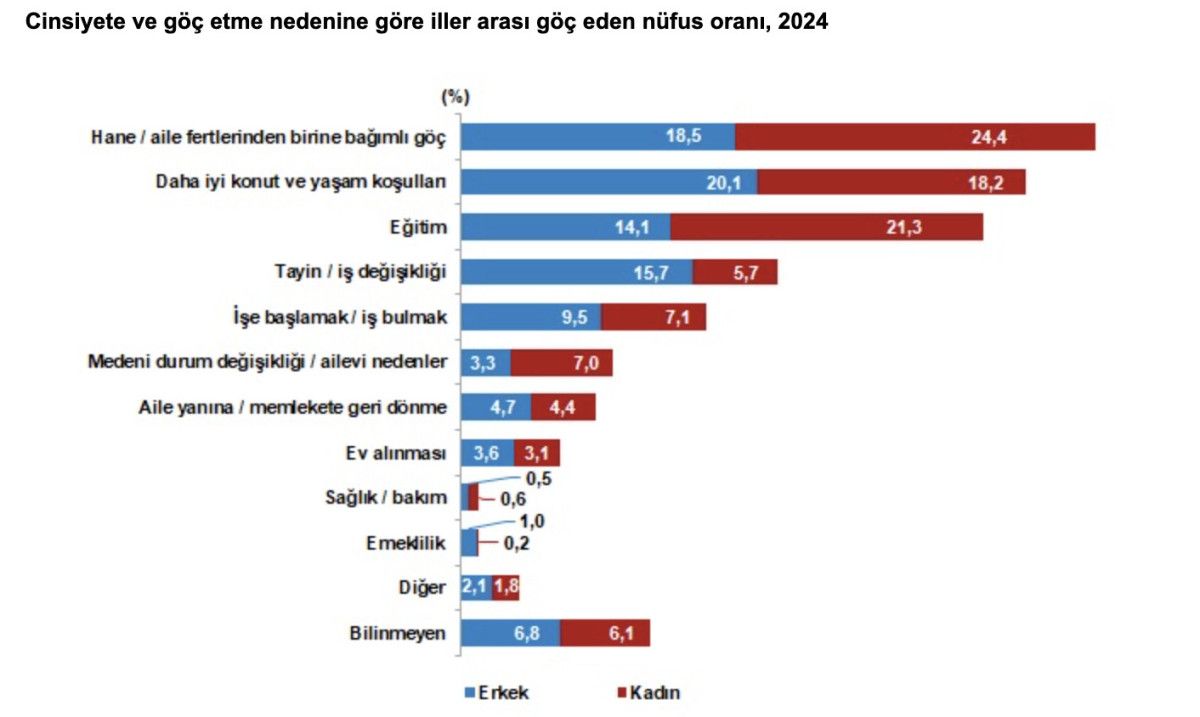Cinsiyete nazaran en kıymetli göç etme nedeni erkeklerde 255 bin 846 bireyle daha yeterli konut ve hayat şartları olurken, bayanlarda 343 bin 342 kişi ile hanedeki fertlerden birine bağımlı göç oldu. Erkeklerde, hanedeki fertlerden birine bağımlı göç ve tayin/iş değişikliği, bayanlarda ise eğitim ve daha düzgün konut ve hayat şartları öteki kıymetli göç nedenleri ortasında yer aldı.