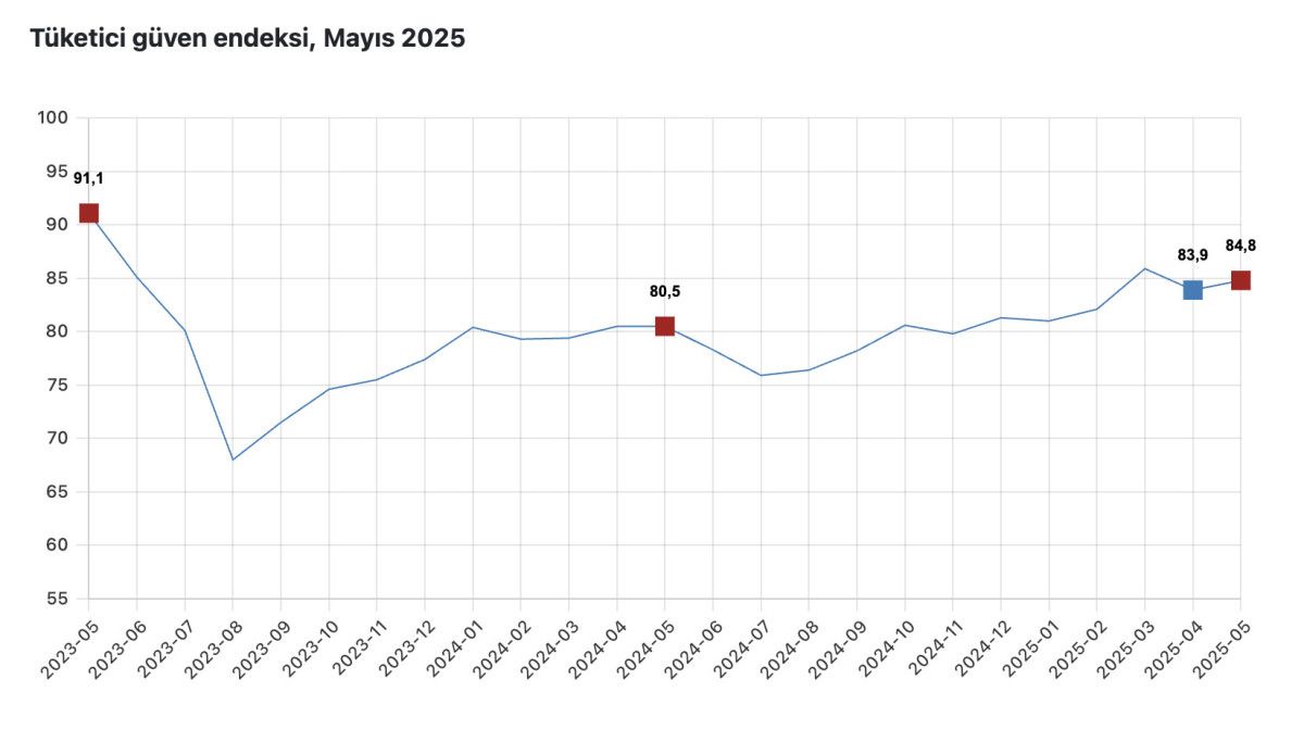 TÜİK ve Türkiye Cumhuriyet Merkez Bankası (TCMB) iş birliği ile yürütülen tüketici eğilim anketi sonuçlarından hesaplanan tüketici itimat endeksi, nisan ayında 83,9 iken mayıs ayında yüzde 1,1 oranında artarak 84,8 oldu.