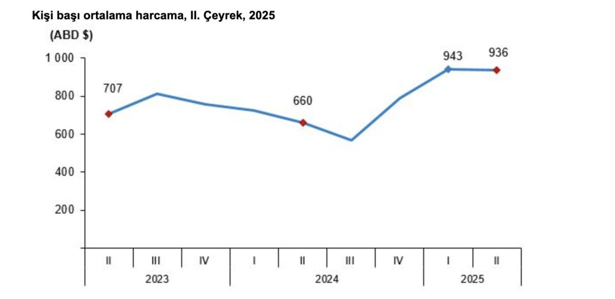 Bu çeyrekte yurt dışını ziyaret eden vatandaş sayısı bir evvelki yılın birebir çeyreğine nazaran yüzde 0,5 azalarak 2 milyon 947 bin 929 kişi oldu. Bunların kişi başı ortalama harcaması 936 dolar olarak gerçekleşti.